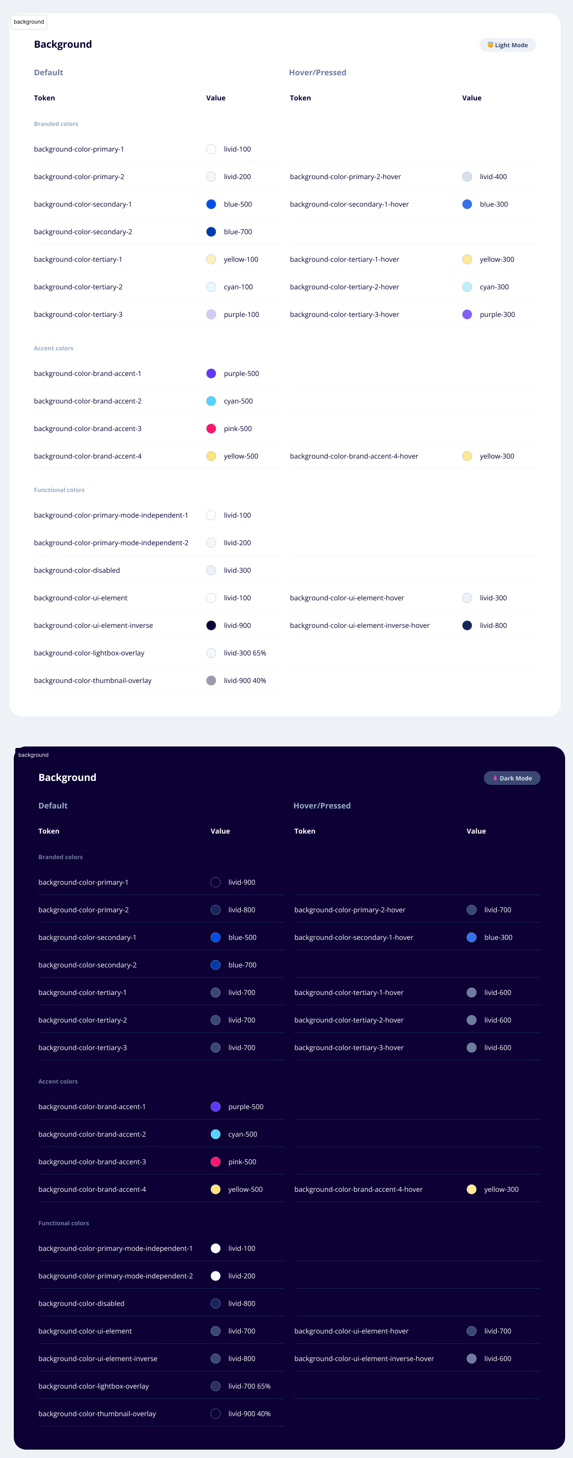 Working again with our DEV partners we began the tokenizing process for a second time. With this work also came establishing a dark mode, to later apply within our atomic design system.